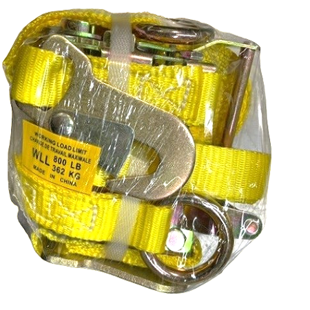 TWO PER PACKAGE. 1" X15FT DOLLY STRAP W/RATCHET, O-RING ONE END & FLAT HOOK ON OTHER END. WLL 800LBS Not for overhead lifting. Never Exceed Work Load Limit.