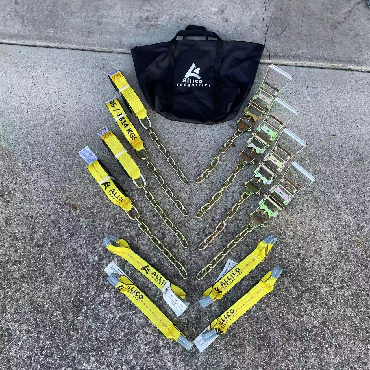 Roll Back Kit with 18' Straps. Each kit contains: Carrying Bag. 4Pcs of 18' long 2" strap with a 5/16" Chain Tail. 4Pcs of 16" Eye to Eye Strap AKA Dog Bone or Bow Tie Strap. 4Pcs of 2" Wide Handle Ratchet with 5/16" Chain Tail. Not for overhead lifting. Never Exceed Work Load Limit.